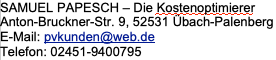 Die Newsletter der SAMUEL PAPESCH - Die Kostenoptimierer enthalten sogenannte Zählpixel. Ein Zählpixel ist eine Miniaturgrafik, die in solche E-Mails eingebettet wird, welche im HTML-Format versendet werden, um eine Logdatei-Aufzeichnung und eine Logdatei-Analyse zu ermöglichen. Dadurch kann eine statistische Auswertung des Erfolges oder Misserfolges von Online-Marketing-Kampagnen durchgeführt werden. Anhand des eingebetteten Zählpixels kann die SAMUEL PAPESCH - Die Kostenoptimierer erkennen, ob und wann eine E-Mail von einer betroffenen Person geöffnet wurde und welche in der E-Mail befindlichen Links von der betroffenen Person aufgerufen wurden.